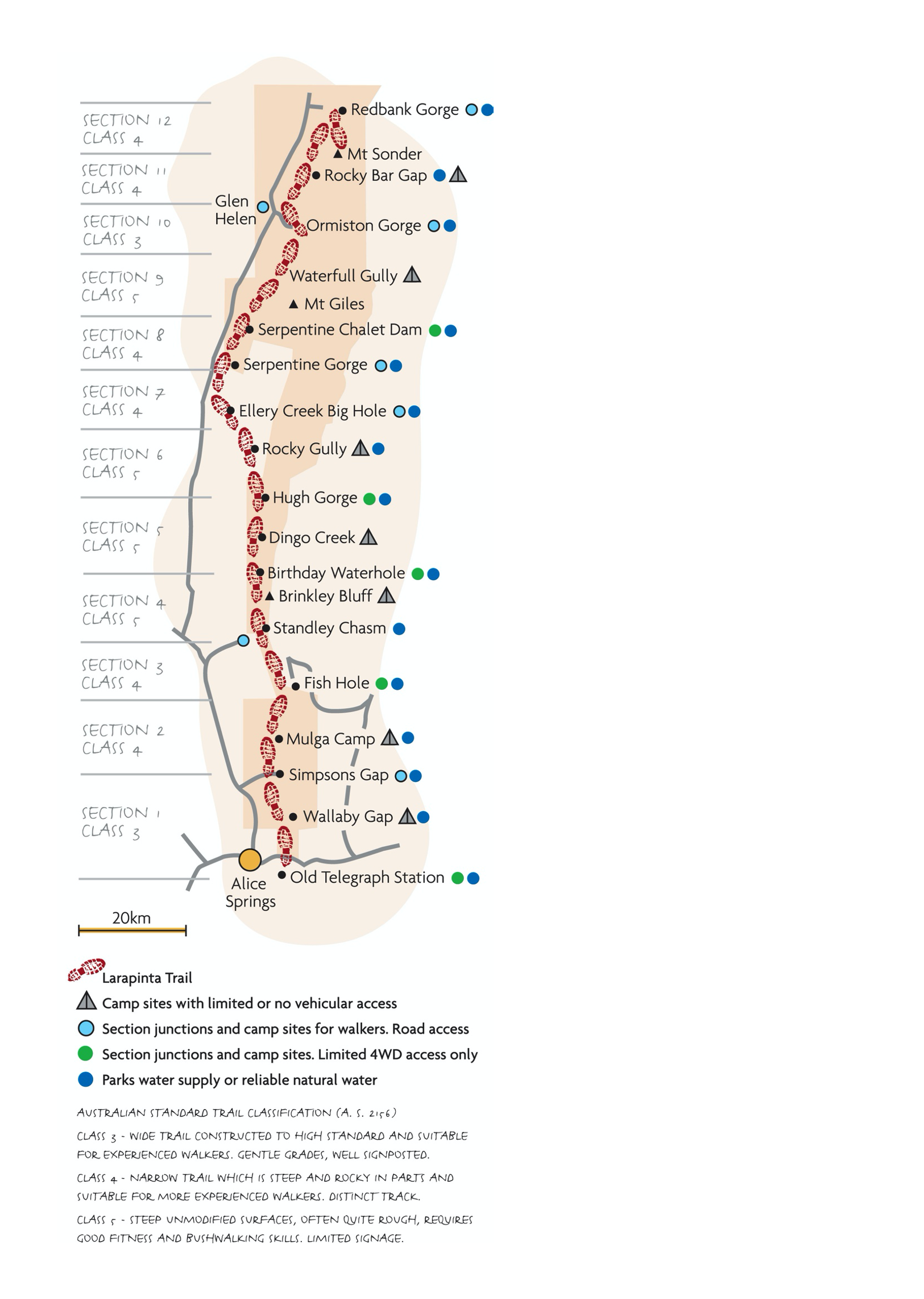 Section 6 is a 31.2km section of the Larapinta Trail. This long and challenging section traverses across the Alice Valley from Hugh Gorge in the Chewings Range to Ellery Creek Big Hole in the Heavitree Range. It is one of the longest and most difficult sections of the Larapinta Trail.