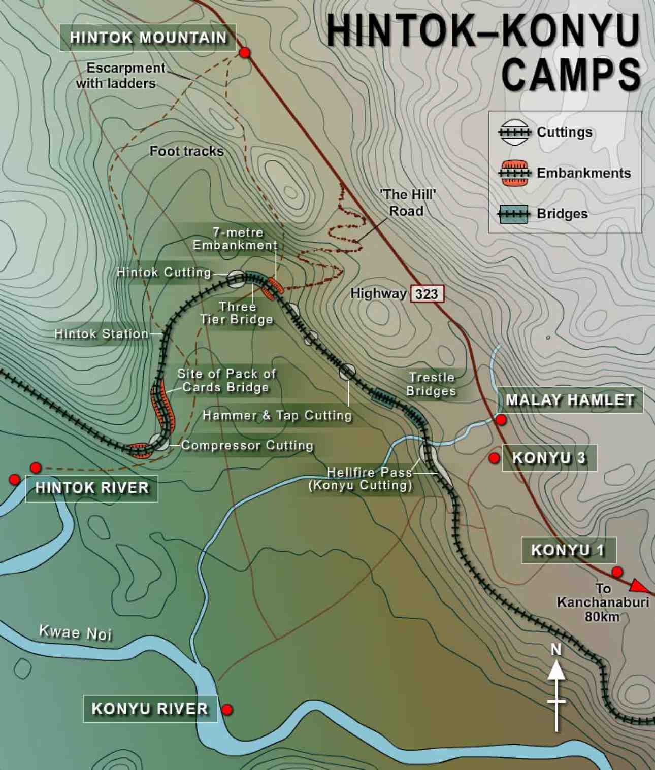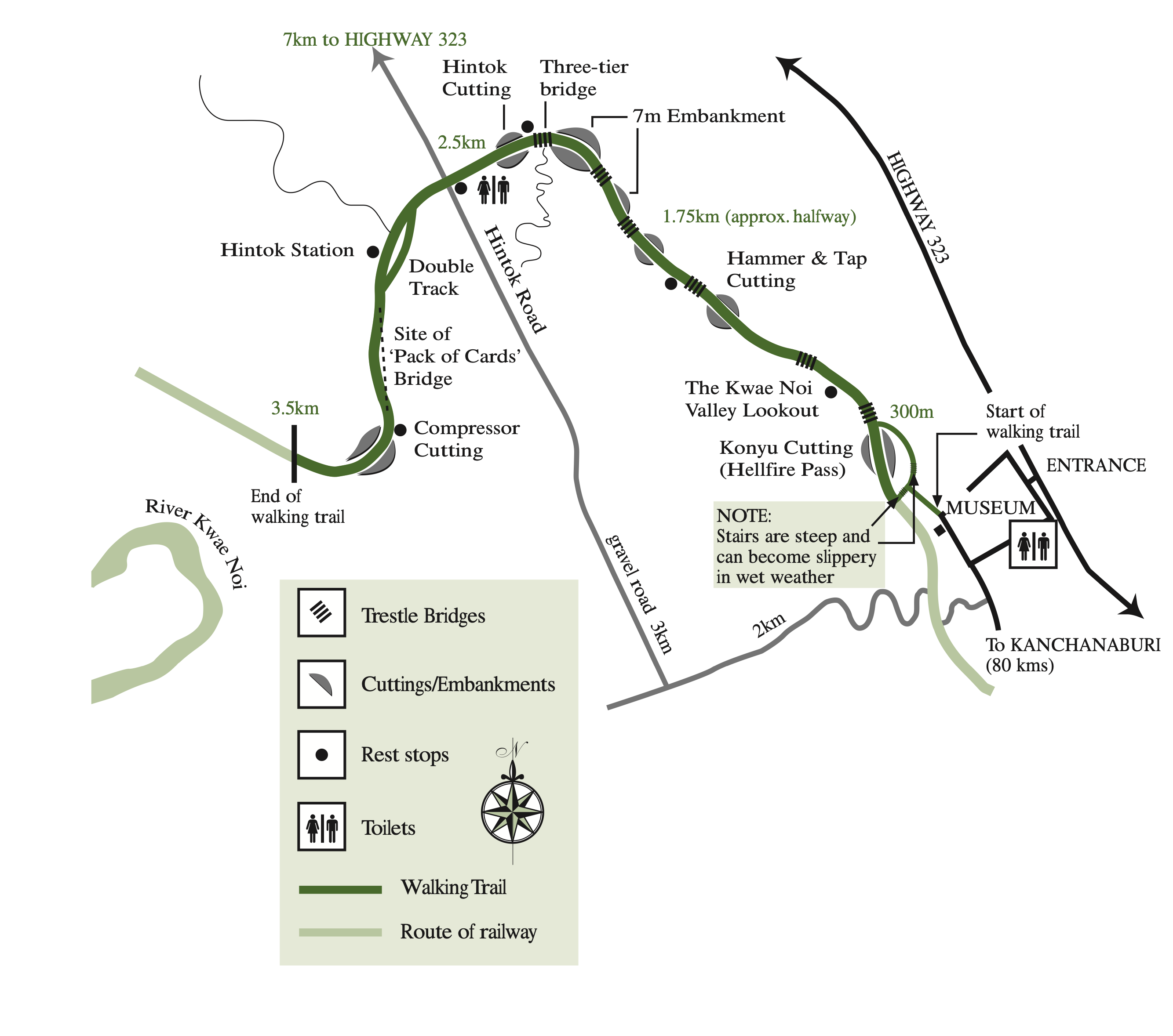 After the service we will enjoy a gunfire breakfast and a visit to the Memorial Museum. We will walk around Hellfire Pass to inspect the area and immediate surrounds. David Howell will lead those who wish to undertake the 3km walk (allowing 45min to 1 hour) along the old rail bed to the Hintok Station area. The remainder of the group will follow in the buses 30 mins after the walking group leaves. We will then all regroup together at the carpark at Hintok Station.